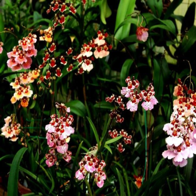 Нежная миниатюрная орхидея онцидиумной группы - толумния не имеет бульб. Все запасы влаги и питательных веществ хранятся в листьях. Толстые листовые пластины имеют ланцетовидную форму, заостренные кончики и зубчатые края. Сформировавшаяся из листьев розетка выпускает цветонос, несущий от одного до нескольких десятков бутонов. Эти орхидеи примечательны тем, что раскрывшиеся на одном цветоносе бутоны часто отличаются друг от друга цветом и рисунком. Родина: тропические леса Южной и Центральной Америки, эпифит. Для успешного роста этим миниатюрам необходимо яркое освещение, высокая влажность воздуха и хорошая вентиляция.