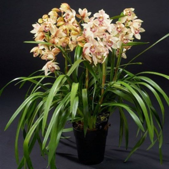 Цимбидиум - крупная, наземная орхидея с большой корневой системой, узкими ремневидными, кожистыми листьями и многоцветковыми поникающими соцветиями. Гибридные виды цимбидиумов выведены как более приспособленные для комнатных условий, они компактнее по размерам и выдерживают высокие до +22+25С температуры квартир. Родина Ю-В. Азия. Орхидея достигает в размере 40х50 см. Даже когда цимбидиум не цветет, красивый и мощный зеленый куст выглядит роскошно и торжественно. С возрастом растения количество цветоносов увеличивается. Цимбидиумы голландской селекции отличаются великолепным качеством и разнообразием сортов