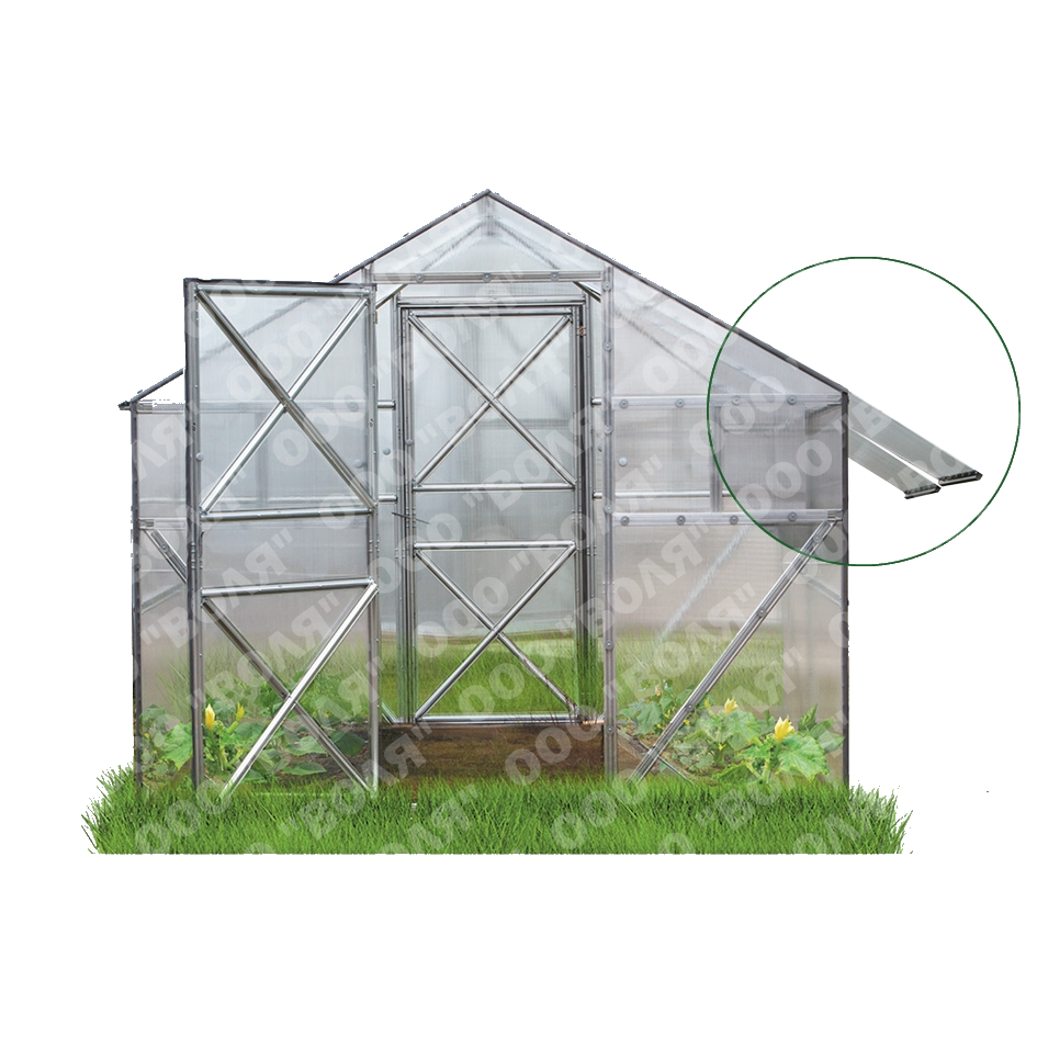 За счет двускатной крыши в теплице больше полезного объема, ведь сельскохозяйственные культуры растут вверх вдоль боковой стенки. Двускатная крыша и специальный узкий оцинкованный профиль обеспечивают максимальное количество света, так необходимого растениям на всех этапах созревания.